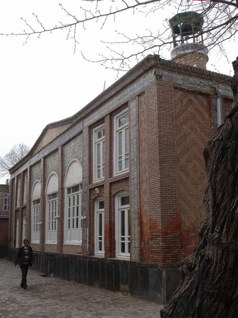 در نماي بيروني بنا کاشيهاي خشتي و کتيبه ها و آجر کاريهايي ديده مي شود (البته کل بنا هم با آجر ساخته شده است). نماي بيروني ساختمان که به خيابان طالقاني باز مي شود. کاشي خشتي و کتيبه هايي از تاريخ ساخت بنا وجود دارد که در پايين آنها را بررسي خواهيم کرد.